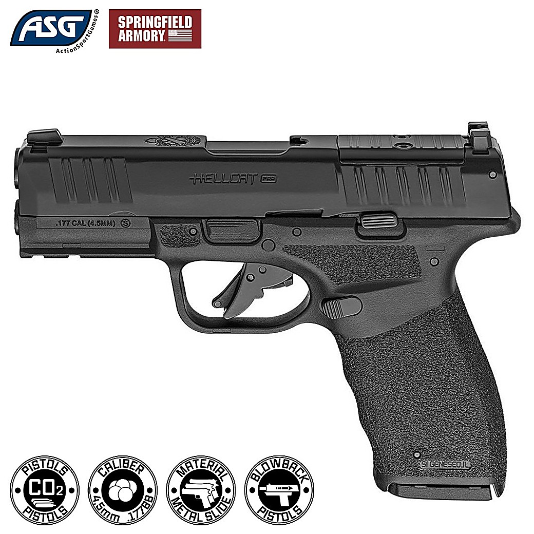 The ASG Springfield Armory Hellcat Pro is a compact, semi-automatic CO2-powered air pistol, chambered for 4.5 mm (.177) BBs.