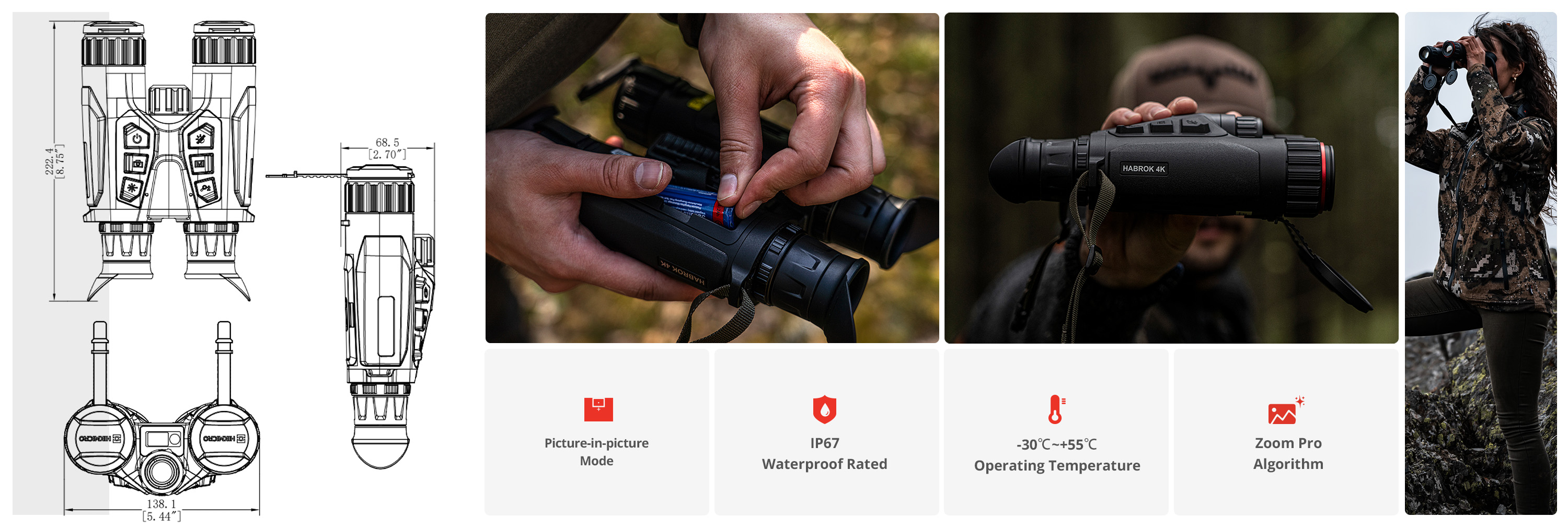 HABROK 4K enables quick and easy positioning of the eye with 60-74mm adjustable interpupillary distance and the new foldable eyepieces - no worry at all if you wear glasses. A 0.49’’ 1920x1080 large OLED screen of multi-spectrum binocular HABROK 4K delivers a comfortable and immersive viewing to users.