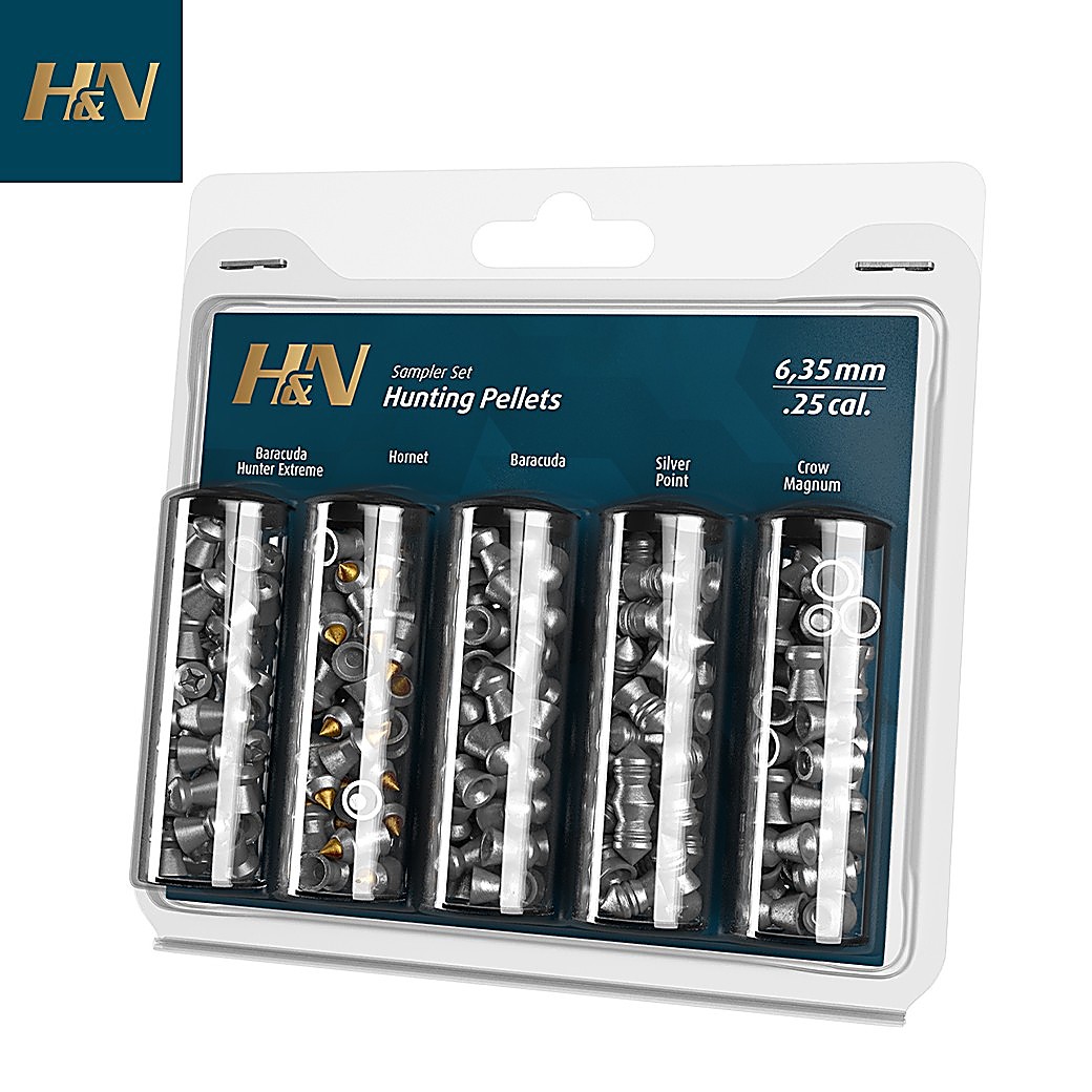 Contenido del juego H&N Hunting Pellets Sampler Set para calibre 6.35 mm (.25).