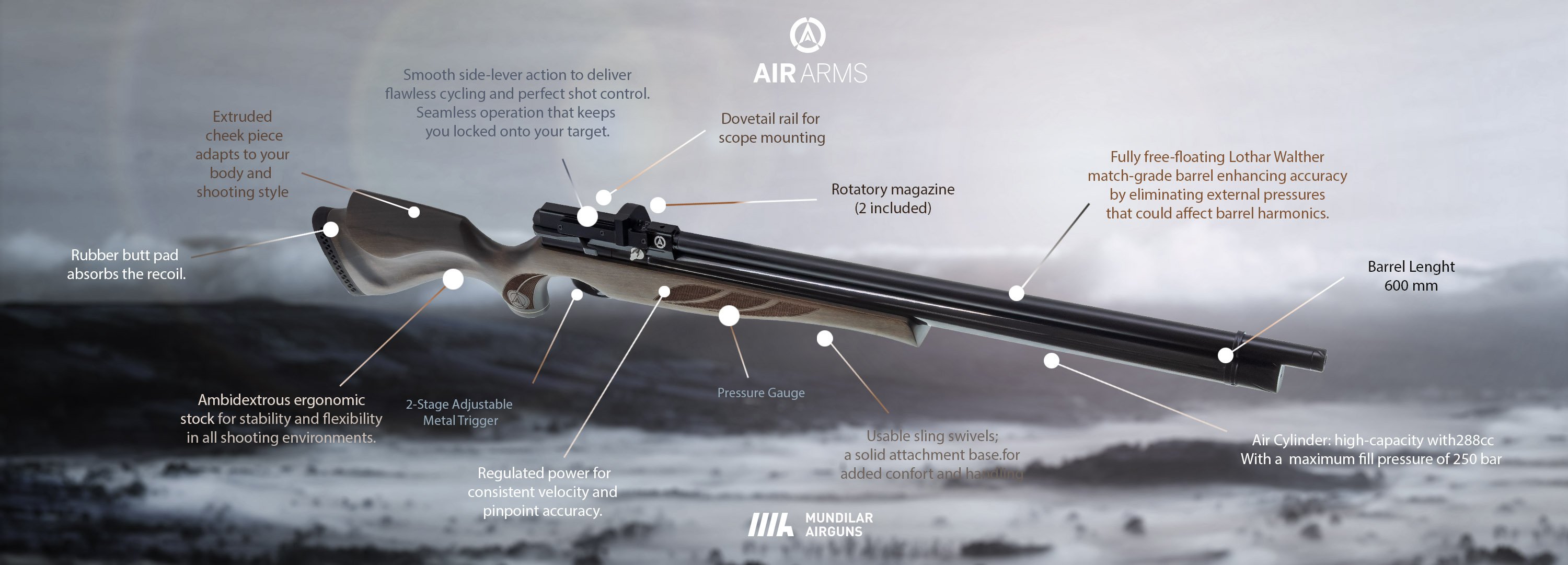 Cuenta con un cañón Lothar Walther extendido de calidad de competición, un refinado funcionamiento de acción mediante palanca lateral, un gatillo de dos fases personalizable y dos cargadores giratorios de 10 disparos.