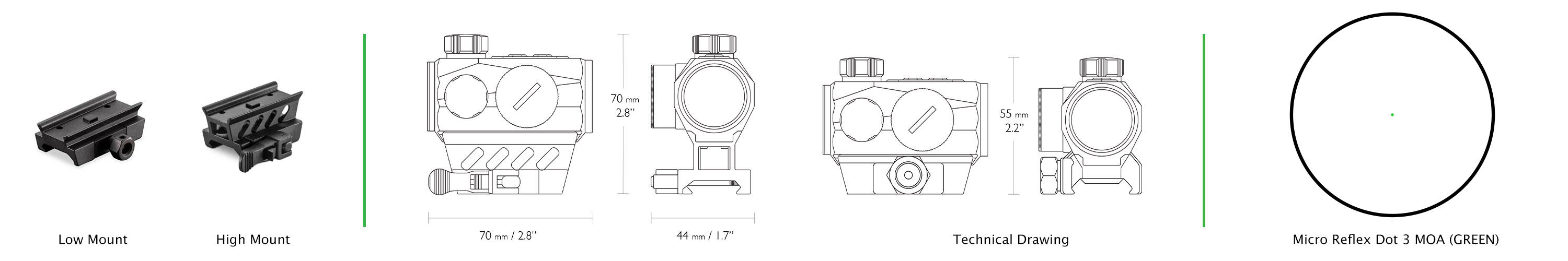 El refinado Red Dot (verde) de 3 MOA ofrece una imagen de visión clara y organizada para una rápida adquisición del objetivo, manteniendo la claridad a cada disparo.
