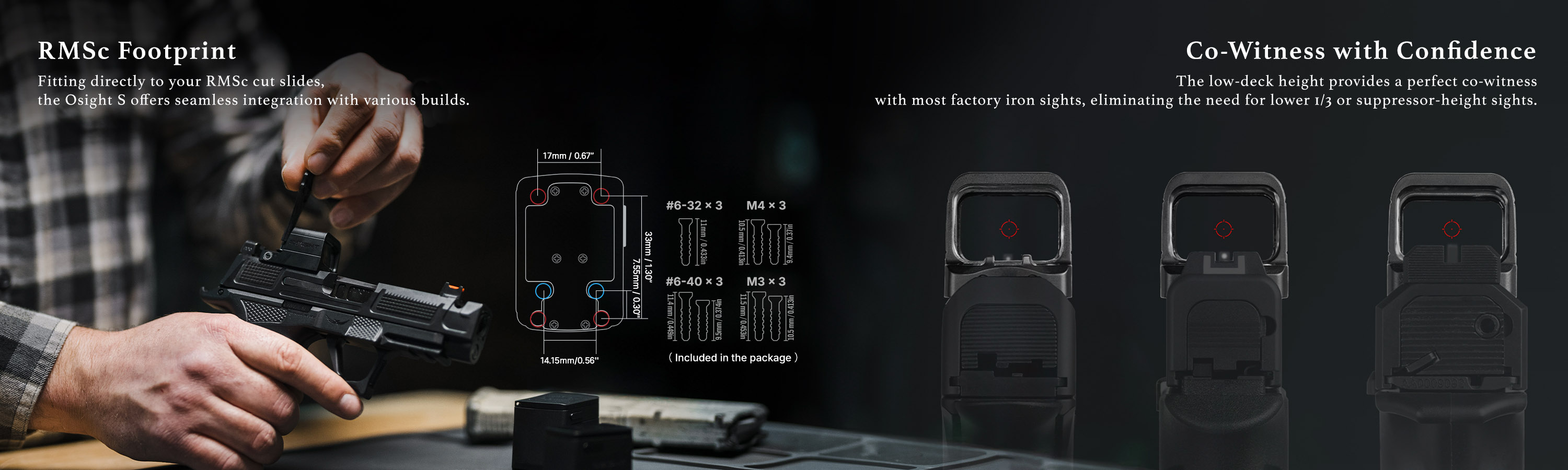 Diseñado para correderas preparadas para ópticas, el Osight S se adapta a una amplia variedad de plataformas sin necesidad de adaptadores. Los juegos de tornillos incluidos garantizan una instalación correcta en diferentes configuraciones.