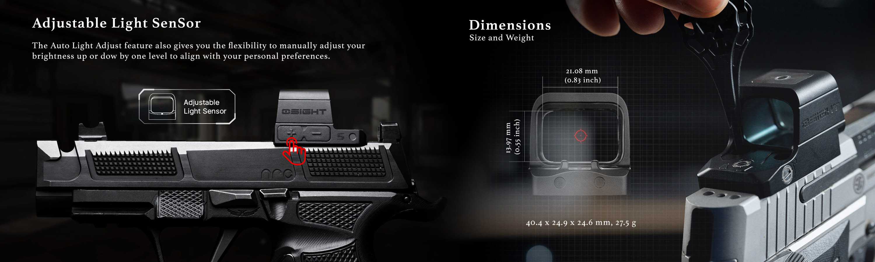 Su tamaño altamente compacto está diseñado para mejorar el rendimiento del tirador en pistolas compactas, subcompactas y micro compactas, manteniéndose adecuado para porte oculto.