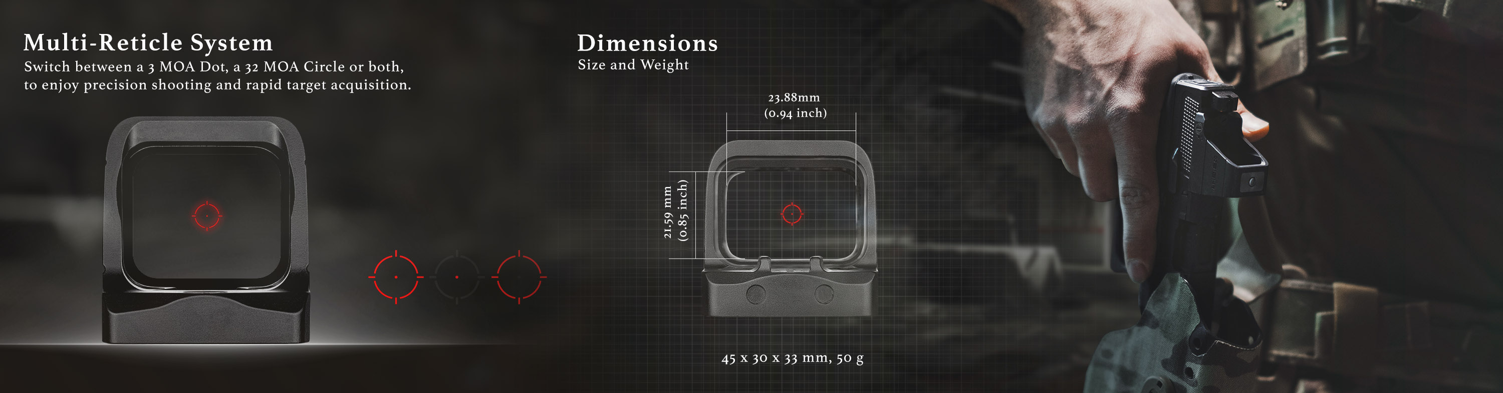Ofrece opciones 3 MOA Dot, 32 MOA Circle y Circle‑Dot para adaptarse al instante entre velocidad y precisión.