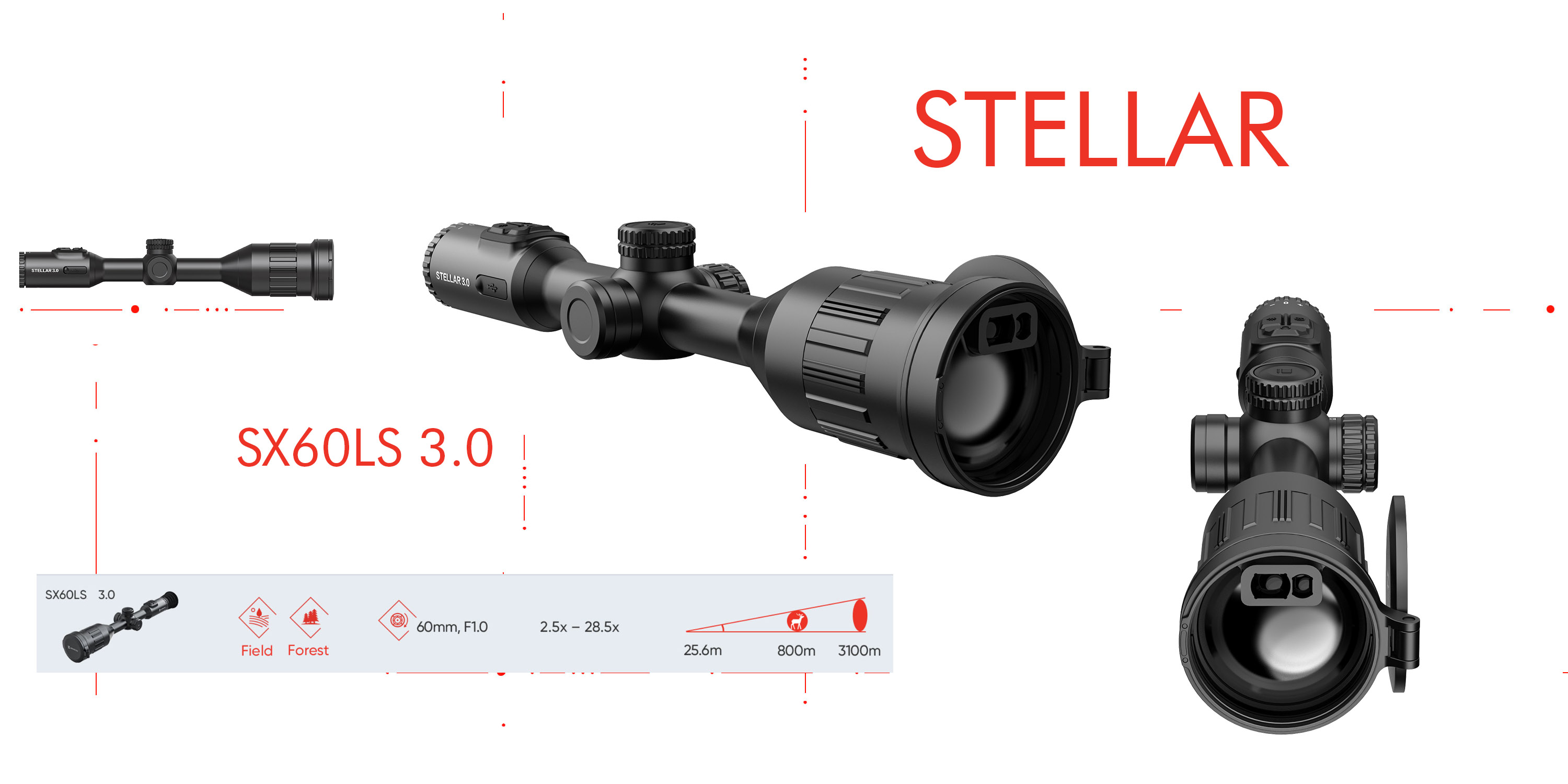 Con un alcance térmico de 3100 m y niveles de aumento ajustables (2.5x - 28.5x) para claridad a largas distancias.
