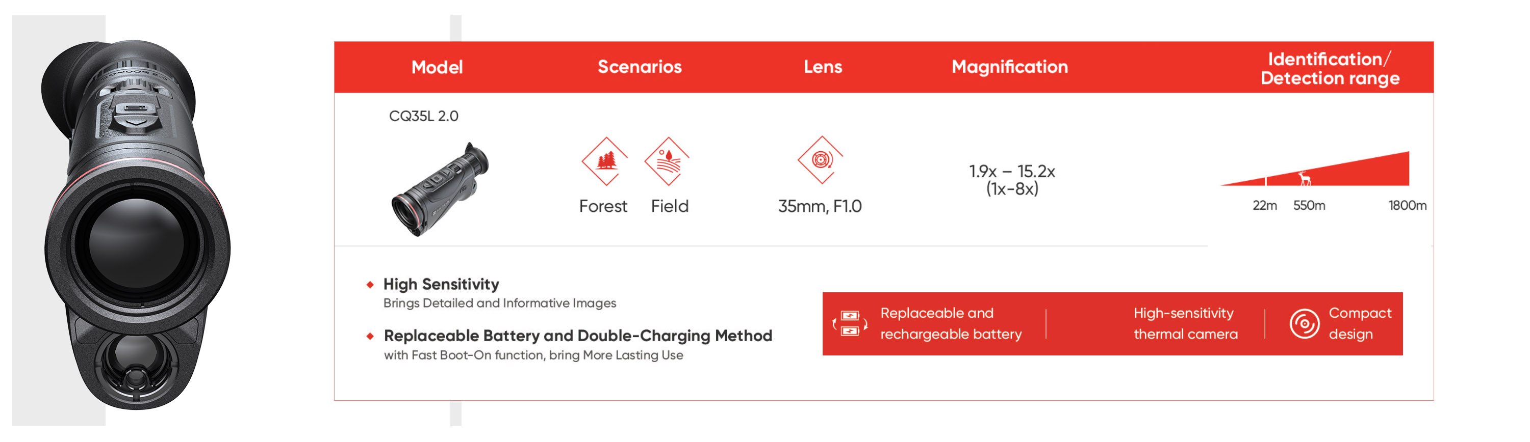 L’objectif 35 mm F/1 offre un champ de vision large et polyvalent, idéal pour la forêt, les terrains mixtes et les balayages dynamiques, tout en garantissant d’excellentes performances de détection à moyenne et longue distance jusqu’à 1800 m.