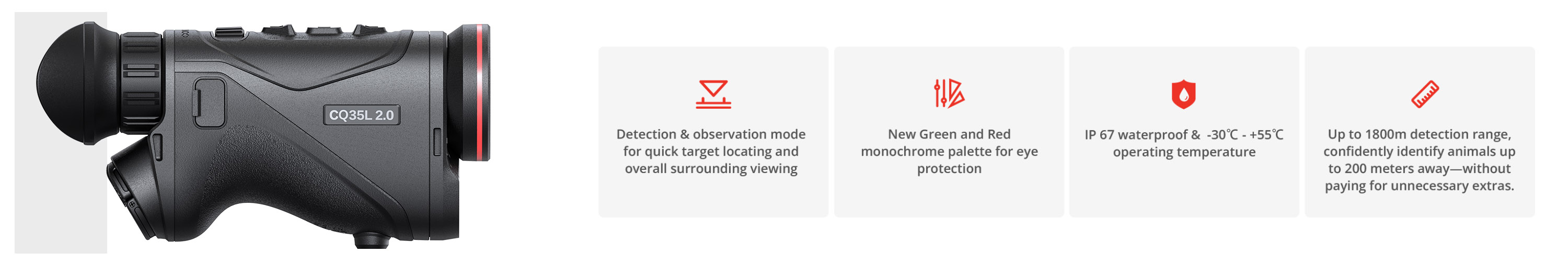 Au cœur de l’appareil se trouve un capteur thermique 640 x 512 / 12 μm avec NETD <15 mK, permettant au CQ35L 2.0 de révéler des détails thermiques fins même dans le brouillard, la pluie ou une forte humidité — des conditions où d’autres appareils peinent.
