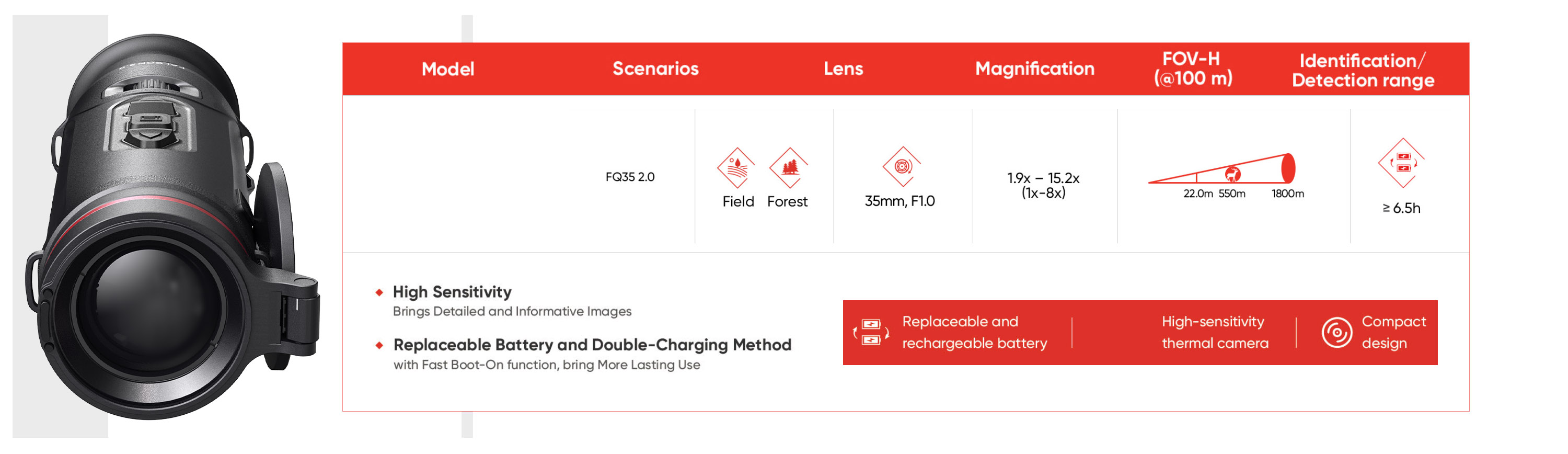 Avec un large champ de vision de 12,5° et une portée de détection atteignant 1 800 m, le FQ35 2.0 excelle dans le balayage de grandes zones tout en maintenant une identification précise à moyenne et longue distance.