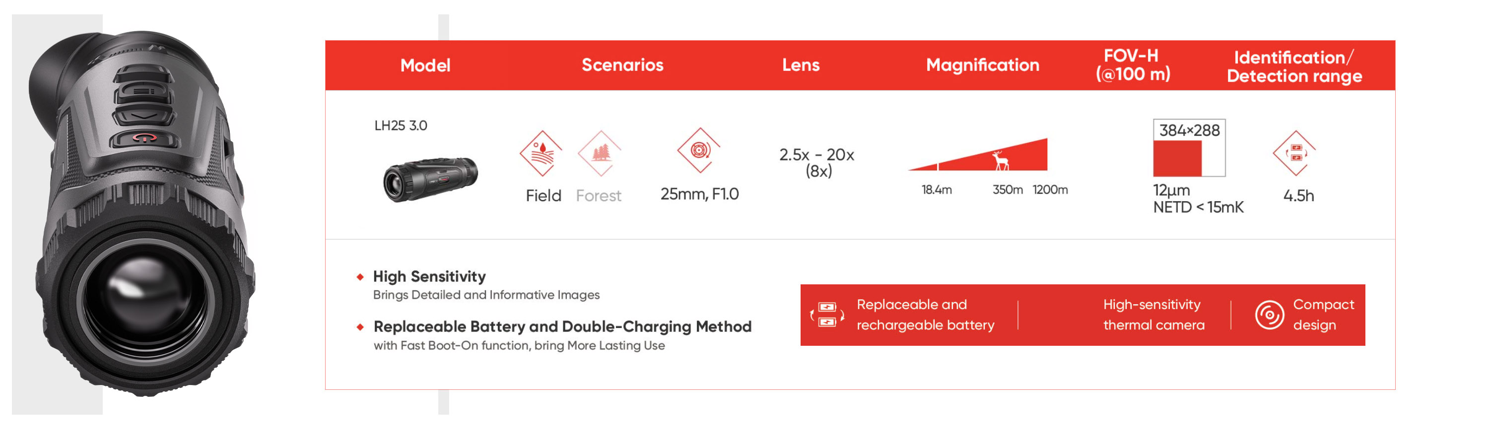 Équipé d’un capteur thermique 384x288 récemment amélioré, avec un pixel pitch de 12 μm et un NETD < 15 mK, associé à un écran OLED net de 1920x1080, le LH25 3.0 offre des images plus fluides, plus claires et plus détaillées que les générations précédentes.
