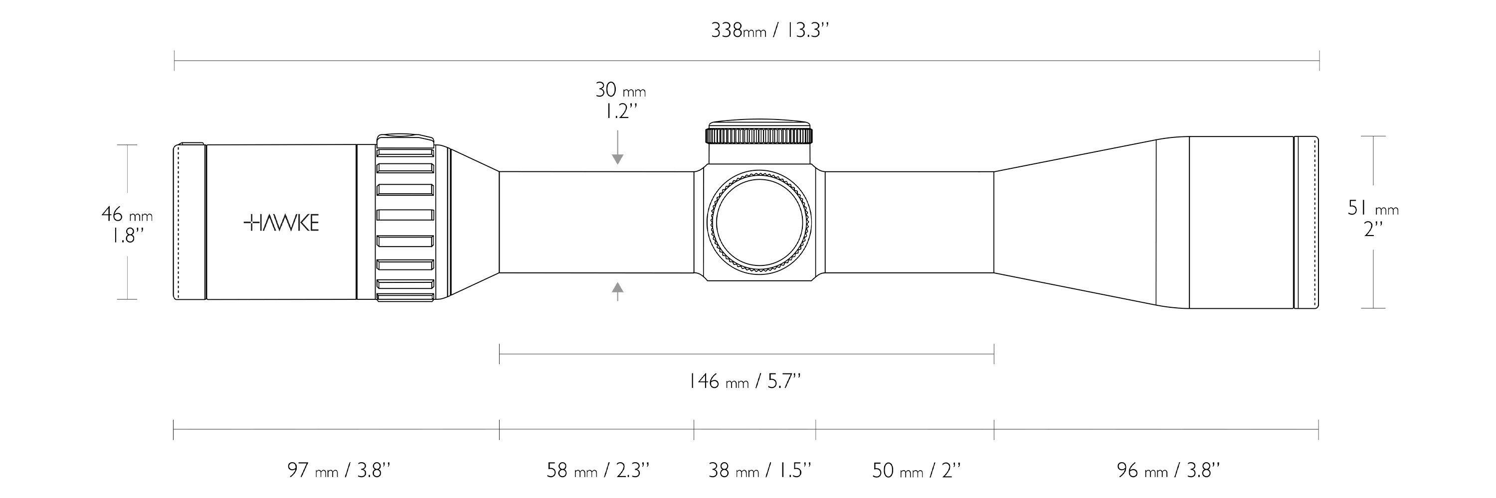 Semblable au réticule LR Dot toujours très populaire de Hawke, le réticule LRX-Hunter offre un réticule de chasse épuré avec des points de visée supplémentaires pour la compensation, basés sur l'espacement balistique des munitions à percussion centrale courantes.