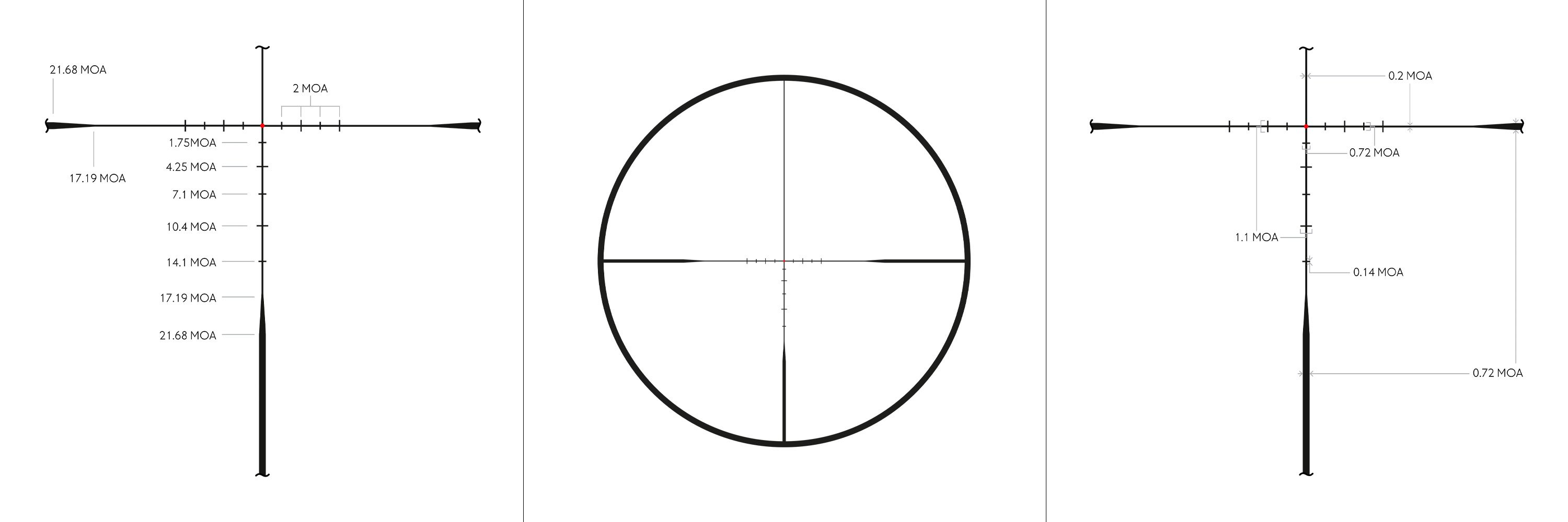 D'un point de vue technique, certaines des spécifications des lentilles comprennent un champ de vision de 12.9 - 2.2m @100m, un dégagement oculaire de 102 mm, une valeur de clic de 1/4 MOA par clic et une plage de réglage de 85 MOA sur les tourelles d'élévation y deviation(max.).