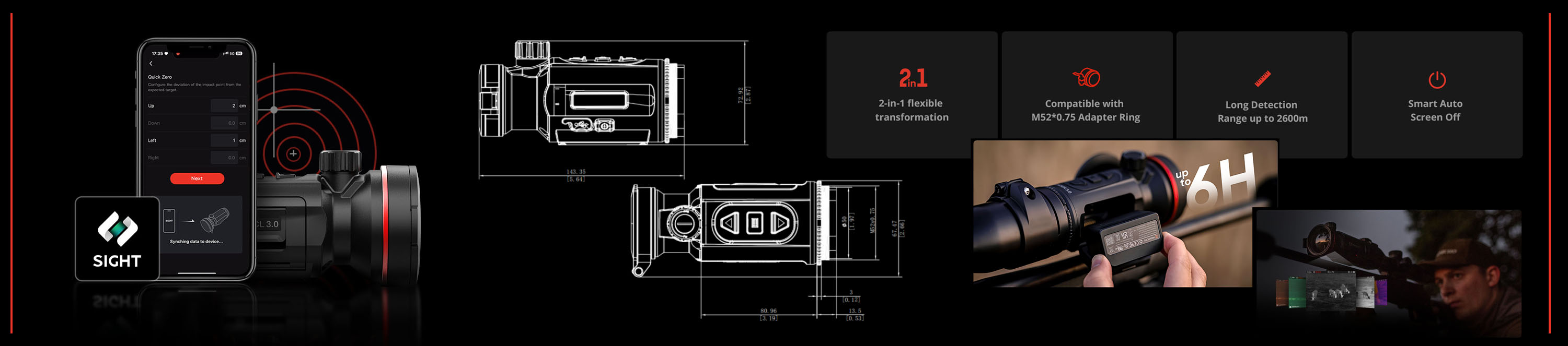 Permite ao utilizador manter o retículo, distância ocular e ergonomia familiares da sua ótica diurna, enquanto ganha as vantagens da deteção térmica.