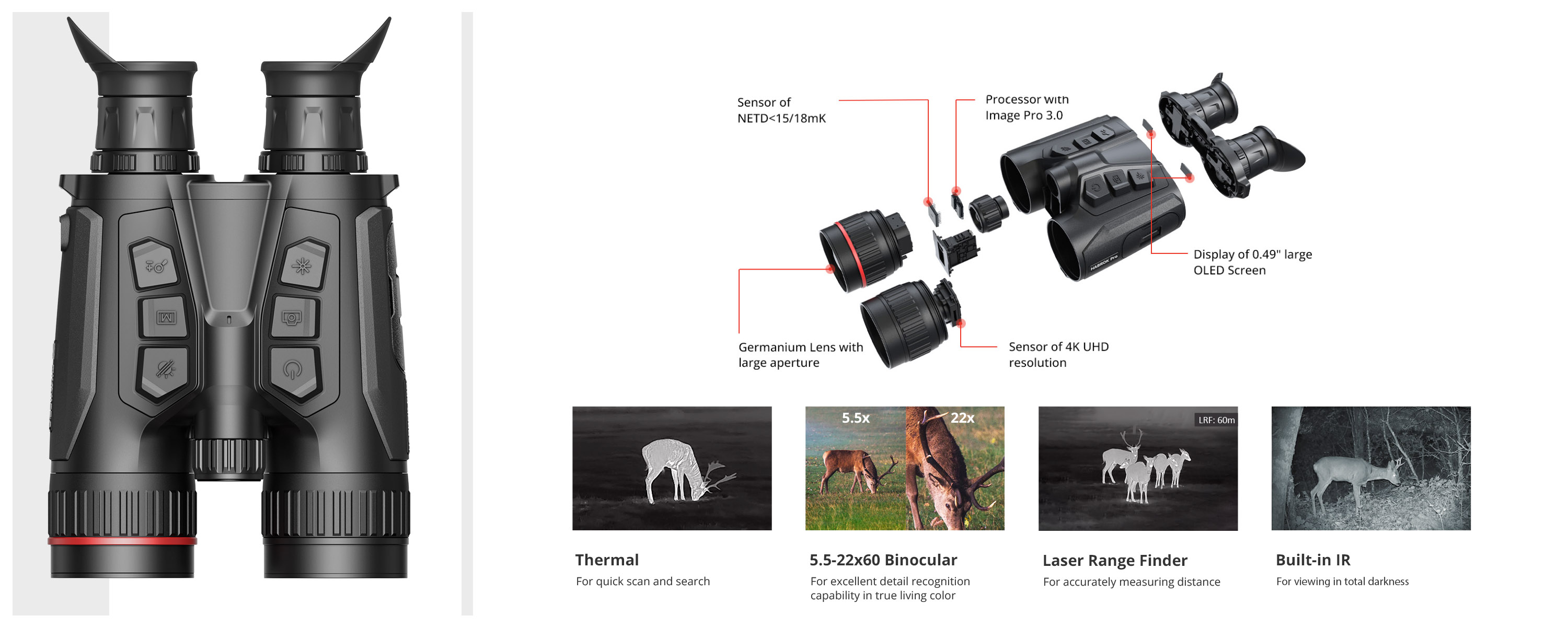 Um dispositivo que combina todas as funções de um binóculo diurno com clareza a longa distância, além de uma câmara térmica de alta sensibilidade e um telêmetro laser com alcance de medição até 1000 m.