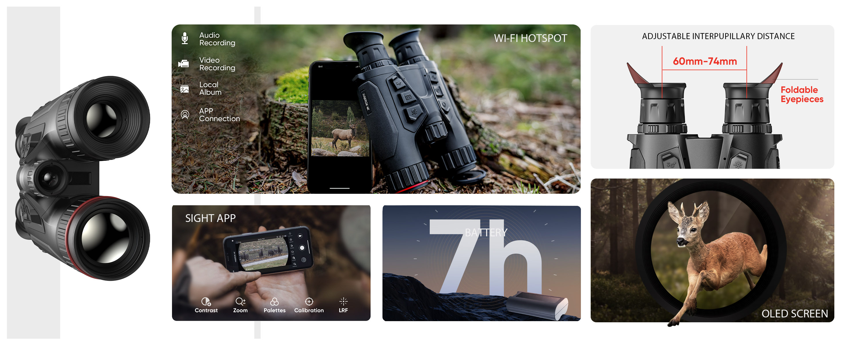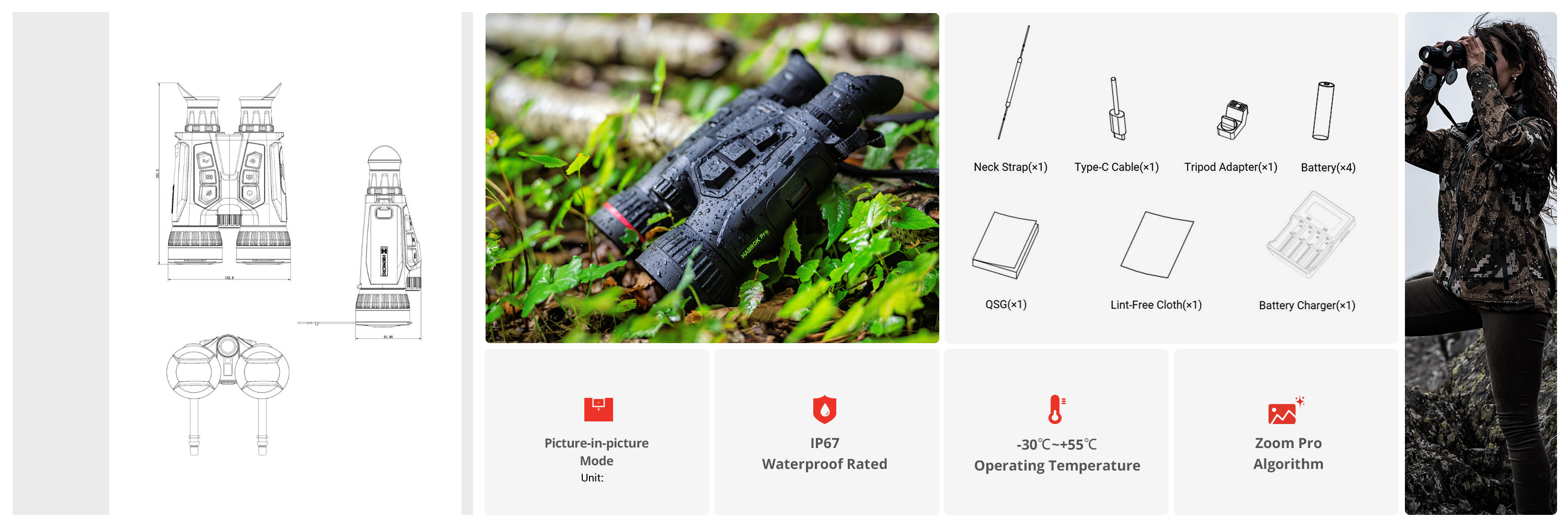 Esta série de produtos é ideal para caça, observação de aves, observação de vida selvagem, aventura e cenários de busca e salvamento.